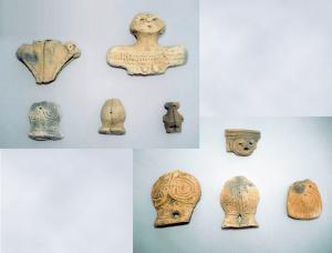 最も多く出土したのは縄文時代中期で、遺物の大半は日常的な生活に使われた土器・石鏃・石斧などの道具ですが、耳飾・玉などの装飾品や、非日常的な祭りや儀式の際に使われたと考えられる「第二の道具」としての土偶も30点余り出土しています。出土した土偶のほとんどは女性や妊婦を表現してあることから、子孫繁栄や食料獲得、繁殖を期待して作られたと考えられます。また、壊した状態で発見される場合が多いため、病気やケガの治癒、死者の再生を祈るためなどに使われたとも考えられています。