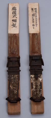 わら靴式スキー(1枚目)、オーストリア式スキー(2枚目)、オーストリア式バッケン(月岡鉄工所製)(3枚目)