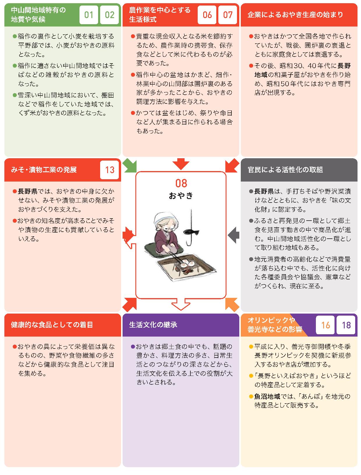 - おやきは郷土食の中でも、話題の豊かさ、料理方法の多さ、日常生活とのつながりの深さなどから、生活文化を伝える上での役割が大きいとされる。