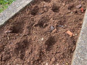 花の色ごとに範囲を区切って、ちどりになるように穴を掘りました。